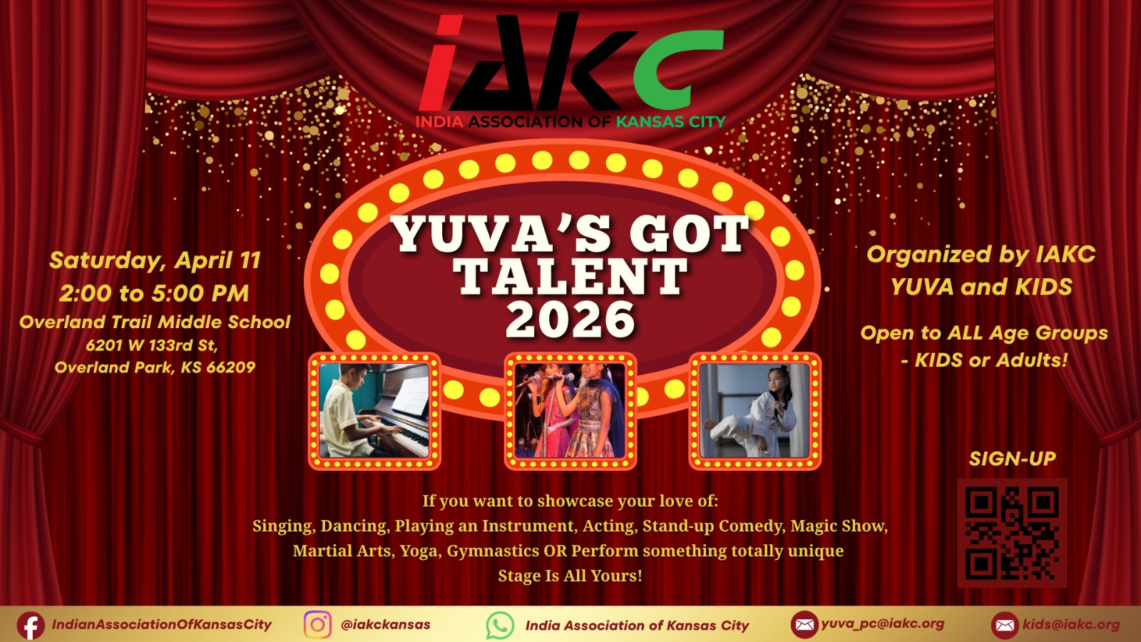 Hey IAKC Fam! 🎉 Get ready to shine! We’re hosting “Yuva Got Talent” – a super fun talent show for ALL AGES on April 11th, 2 pm to 5 pm! 🌟